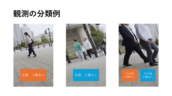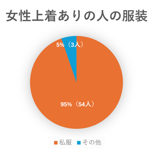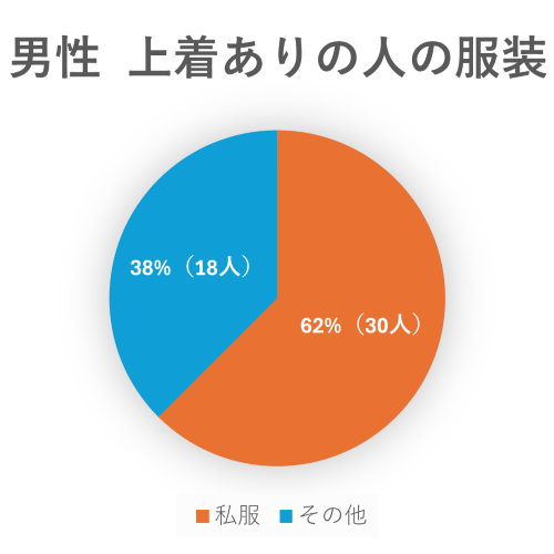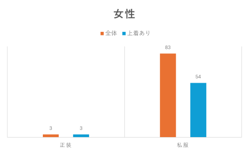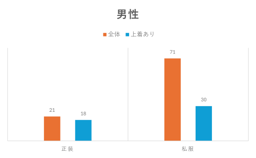 ・また、私服よりもスーツや制服で上着を着ている人の割合が多い理由は、スーツや制服が職場や学校での服装であり、上着を着ることでよりきちんとした印象となるからだと考えられる